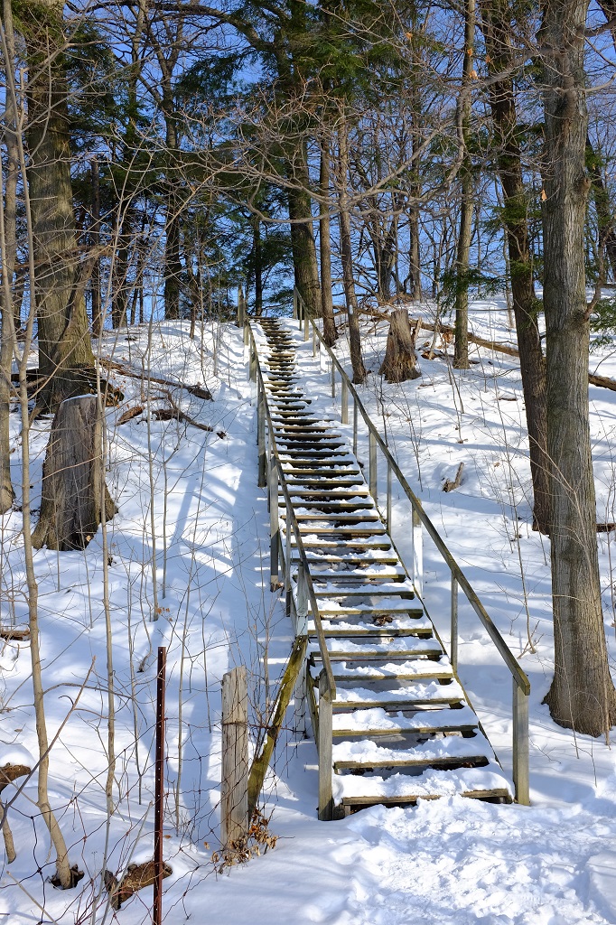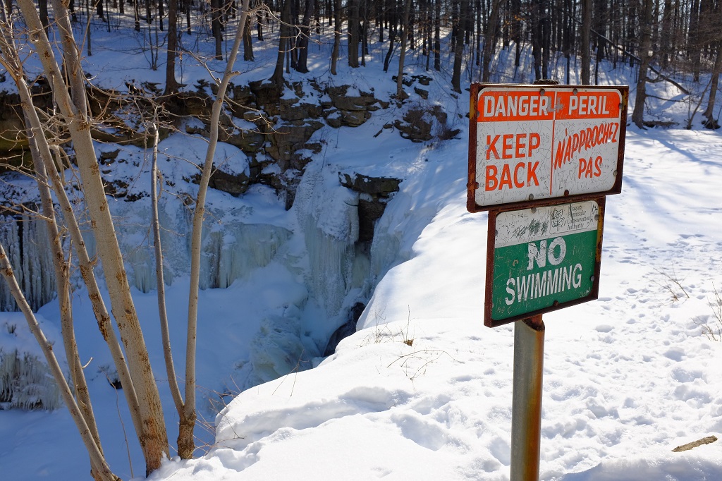Balls Falls consists of the Upper and Lower Falls along Twenty Mile Creek, and a number of heritage buildings have been preserved on the site. The Twenty Valley Trail is a short but steep and rocky descent alongside the creek, and can be a bit tricky in the snow. It then follows the creek before continuing as the Bruce Trail, and you can loop back to the starting point via a paved road. In terms of elevation changes, there really aren’t any – however walking through some areas with knee-deep snow can present its own challenges. You can rent snowshoes at the conservation centre, although they really aren’t needed.