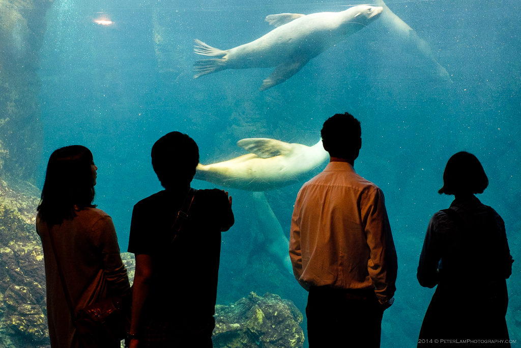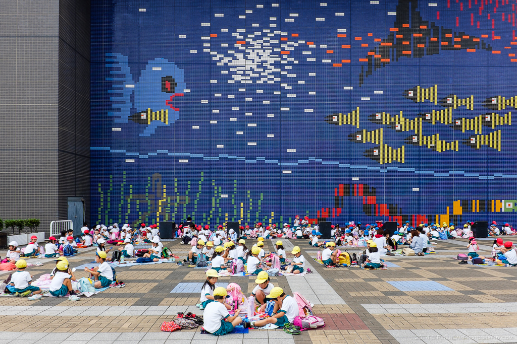 The Osaka Aquarium, also known simply as the Kaiyukan, is one of the largest aquariums in the world, and so naturally warranted a visit during my recent trip to Japan’s Kansai region. It is located within a few minutes walk of Osakako station, at the Osaka portlands and next to Tempozan Harbor Village. The building is hard to miss – just look for the huge Tempozan Ferris Wheel and you’re there. The aquarium is very popular with families and local school trips. During my visit there numerous groups of (well-behaved) Japanese school children marveling at the sights.