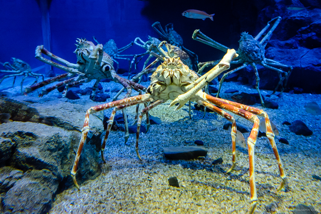 The aquarium is a 7-storey structure with various exhibits centered around a large central tank that spans the entire height of the building. You start the tour on the top floor and make your way down the building in a spiral around the central tank. Focus is on the aquatic habitats of the Pacific Ocean’s “Ring of Fire” area, from California’s Monterey to Australia’s Great Barrier Reef and Japan’s deep sea trenches. The large center tank is an impressive display of aquatic life, which includes all manner of rays, large fish, and the star attraction: a huge whale shark.