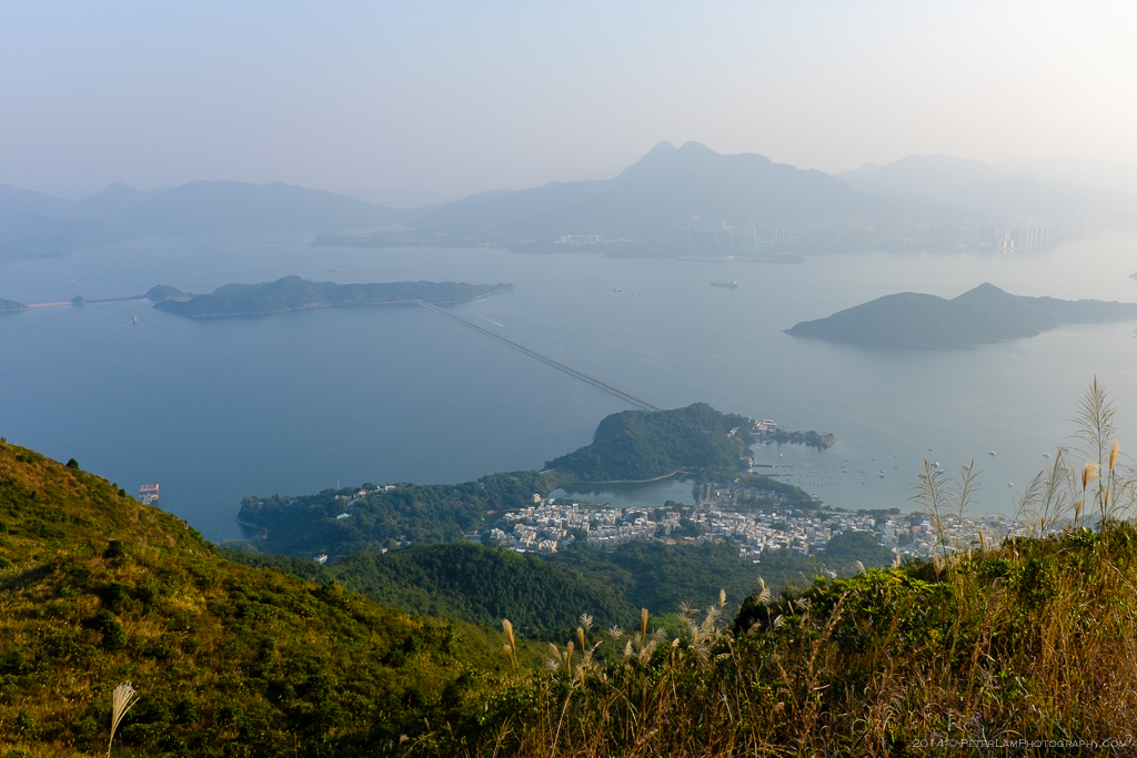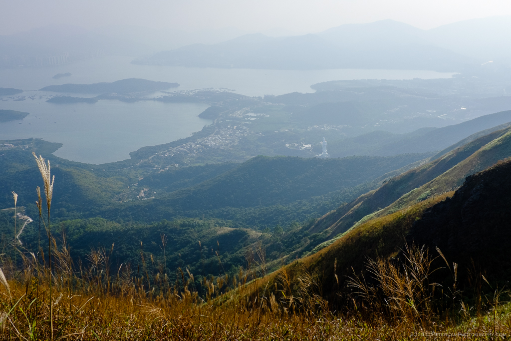 Looking south from Lei Pek Shan, a hazy view of Tolo Harbour. Can you see the Guanyin statue and Tsz Shan Monastary?