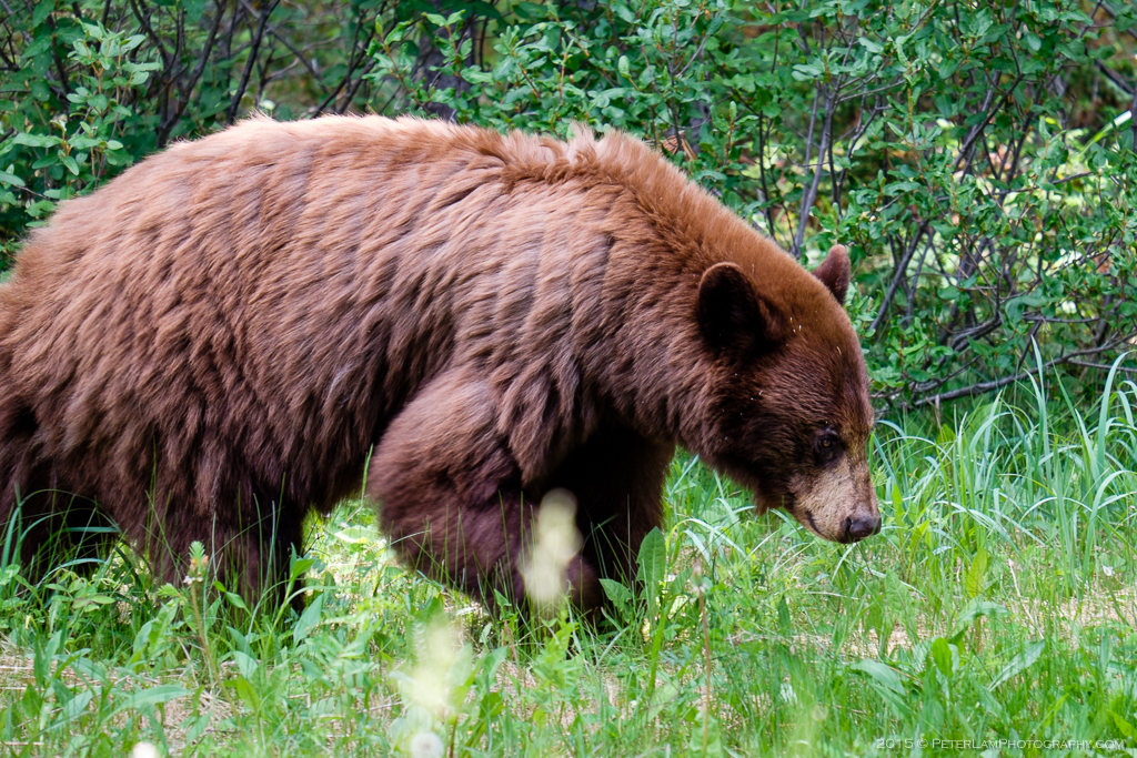 This is a beautiful drive that is not fenced, so the chances of seeing some wildlife is greater – and as it happened, we were lucky to spot a large bear foraging right next to the road. A number of cars had pulled over and were taking pictures – the bear completely ignored us and went about his business. What a magnificent animal!