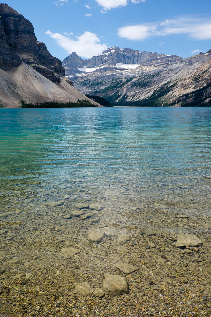 Further along the Icefields Parkway, there is a lookout point near Crowfoot Mountain and beautiful emerald-coloured Bow Lake. The Crowfoot Glacier is clearly visible on the upper half of the mountain. The lake is shallow enough to wade in (and we did, if only for a few seconds at a time, because it was incredibly cold). The view here is one of the most beautiful on the entire parkway. The sheer scale of it is something hard to capture in a photo – you really have to be there.
