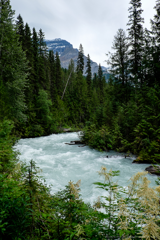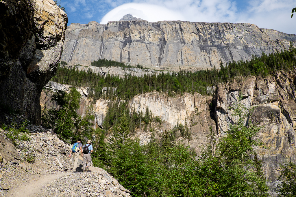 As promised by the weather forecast, the skies cleared a little and we took the opportunity to explore the camp and surrounding area. The next 5 km of the Berg Lake Trail winds through the Valley of a Thousand Falls, where numerous large and small waterfalls line the steep rock walls. This section is also the toughest part of the hike, as it is quite steep. We took advantage of the good weather to do a pre-hike up the slopes, free from our heavy backpacks; we were also expecting some rain the next day, so now was a great time to take pictures. The sheer massive rock faces and the roaring waterfalls were simply awe-inspiring.