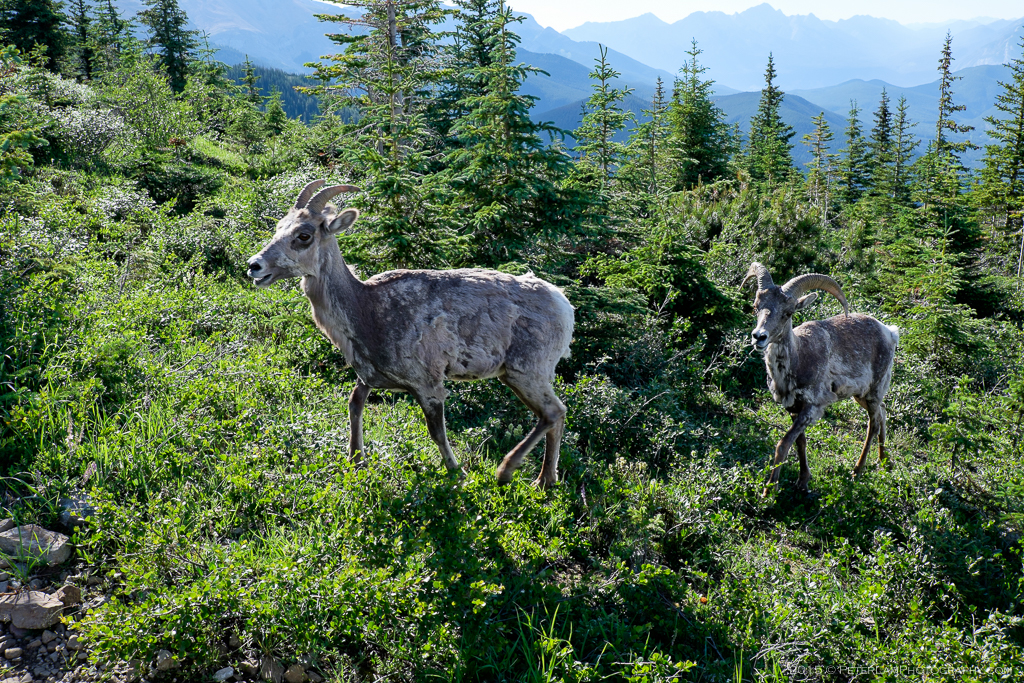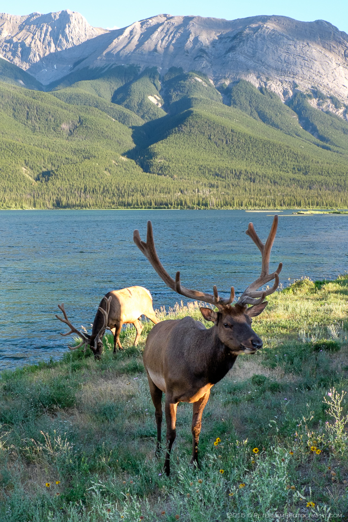 After returning to the parking lot, we were all exhausted. It had a been a long downhill stretch at a good pace, and we opted to skip the soak in the hot springs as it looked a little too much like a public pool (and was very crowded). We decided to stop in Jasper for dinner before continuing to Banff Town where we had arranged for accommodations that evening. It would not be the end of our wildlife encounters, though – right on the side of the highway, three or four elk were grazing by the lake. Cars were pulling over and everyone was taking pictures. I guess the animals were quite used to this as they completely ignored the commotion and walked lazily by. What a great way to end our hiking day.