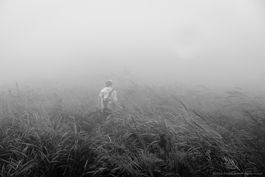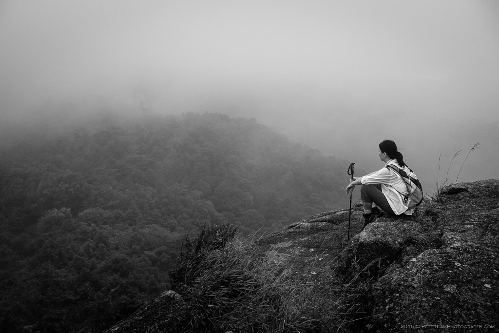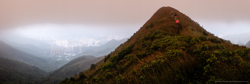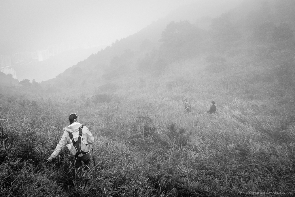 Clearing the tree line, we could barely make out Sha Tin town in the valley below. Low cloud cover limited visibility and we could barely see more than 10m ahead. We were literally hiking in the clouds. It was also quite damp, so some steep sections of the path were muddy and slippery.