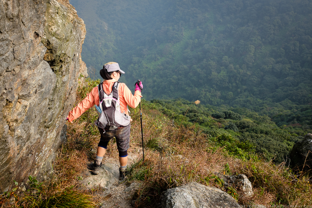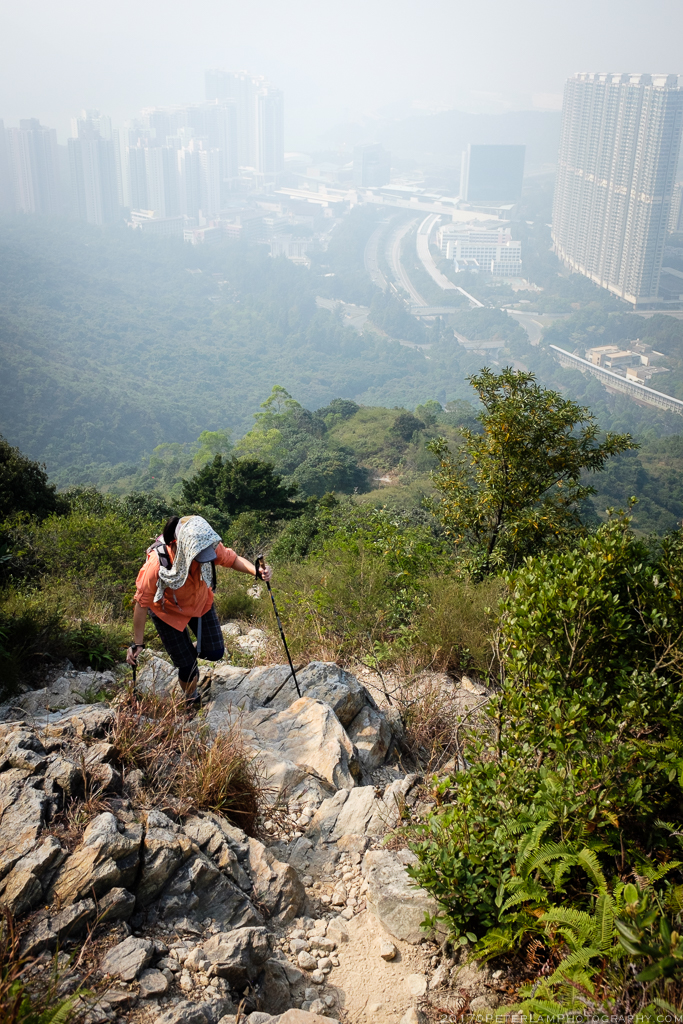 The last section of the climb to Por Kai Shan was through some very dense growth that basically turned it into a steep bushwacking exercise, with portions requiring clambering on your hands and knees. Finally reaching the peak, we took a well-deserved break and enjoyed the hazy views of Tung Chung and the surrounding hillsides below. In contrast to the heavy brush on the northern slope, the opposite southern side is weathered and rocky with little vegetation. With a steep 60-degree gradient, this is not a section for the faint-hearted or anyone afraid of heights. The descent requires your full concentration, as one wrong step could easily result in disaster… On more than one occasion the “on-your-bum” technique was the only way to go!