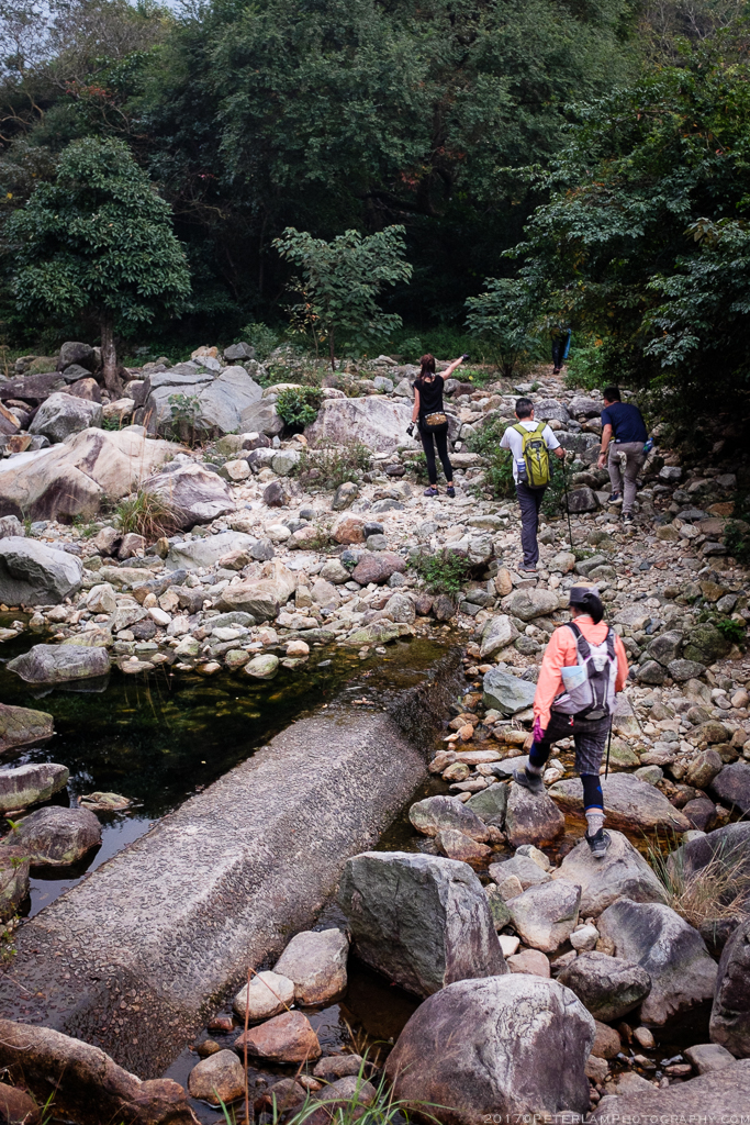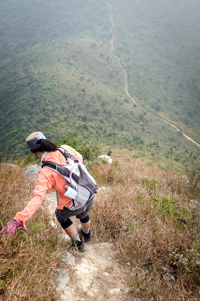 At about two-thirds along the ridge, we begin our descent down towards Wong Lung Hang on a ribboned sidetrail. Once again this is a very steep and tricky path, so great care must be taken clambering down. The trail follows an undulating mountain ridge that starts off bare but becomes increasingly dense with bushes and trees, so some bushwacking is required here too. We found ourselves hanging on the branches for support in some of the steeper inclines. By the time we reach the water catchment and basin at Wong Lung Hang, we’ve descended over 400m and it’s well past sunset. This is one trail you don’t want to do in the dark.