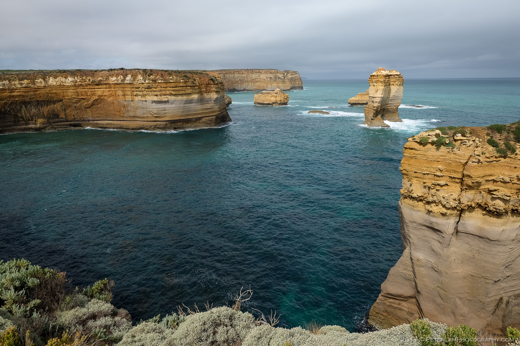 Continuing west, we reach what is probably considered the premier attraction in the area – The Twelve Apostles. These are a number of limestone stacks just off the shoreline, dramatically punctuating the rugged coast for several kilometers. Due to continual natural erosion activity there are only eight “apostles” left standing. The formations are a huge tourist draw, as evidenced by the throngs of visitors at the various lookouts.