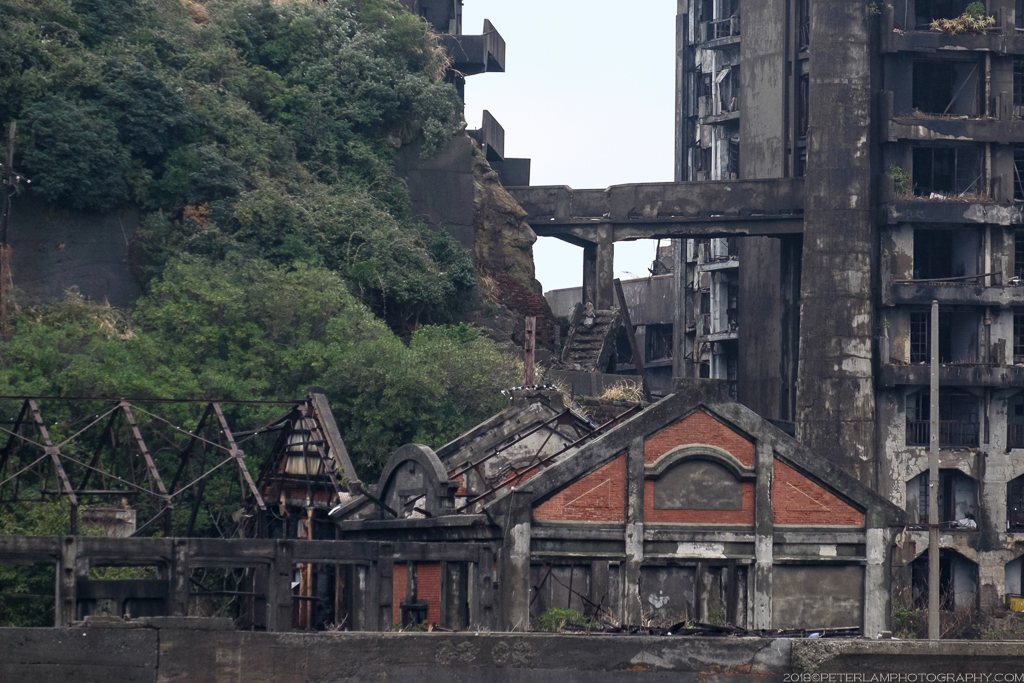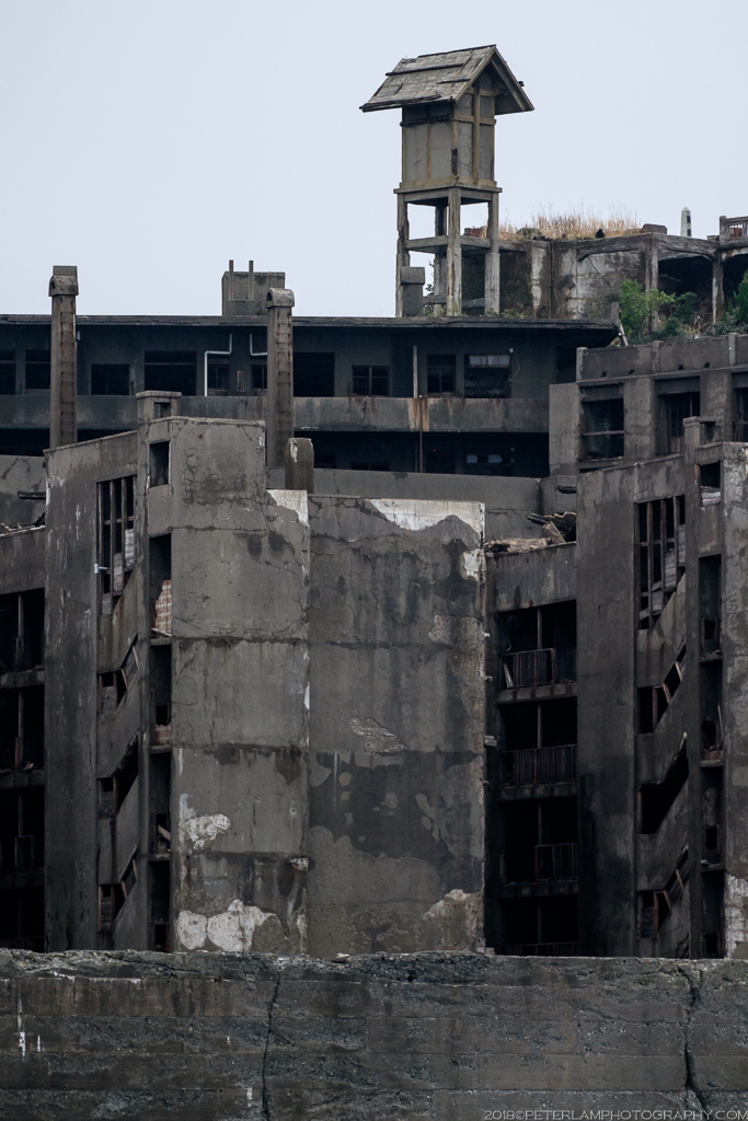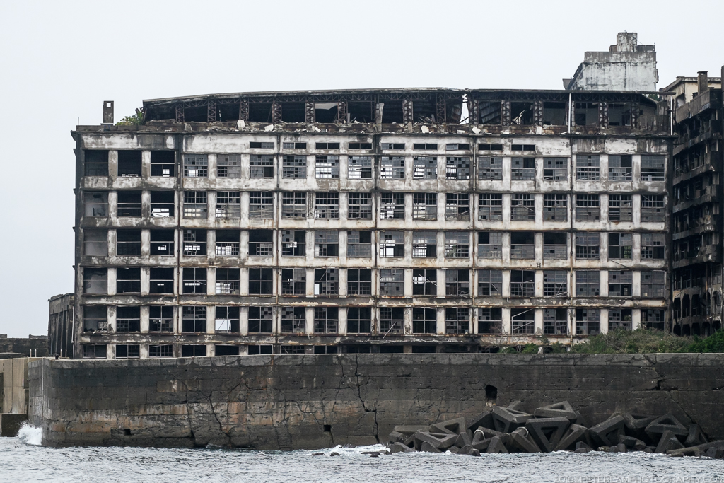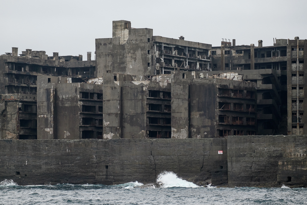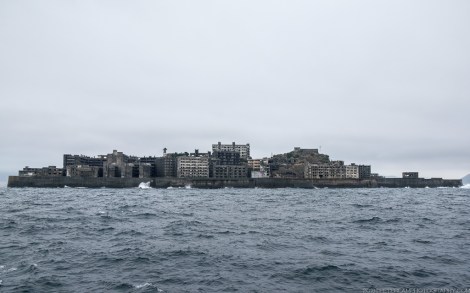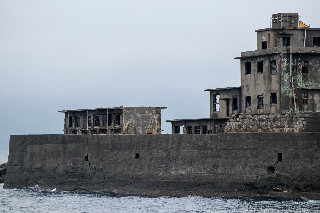 One of the most anticipated visits on my recent southern Japan tour was a trip to Hashima (端島), commonly known as Gunkanjima (軍艦島 – “Battleship Island”). Located some 15 kilometers south of the port city of Nagasaki, this tiny island is known for its surrounding seawall and abandoned concrete buildings, undisturbed except by nature for over 40 years. In popular culture it was featured as the villain’s lair in the recent James Bond movie Skyfall, and in 2015 was added to UNESCO’s World Heritage list as one of Japan’s sites of the Meiji Industrial Revolution: Iron and Steel, Shipbuilding and Coal Mining.