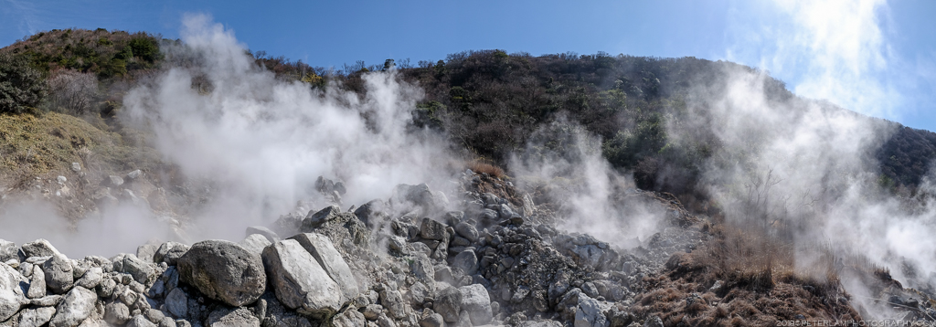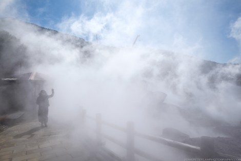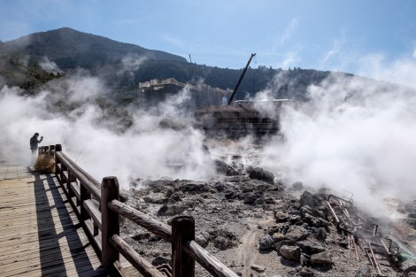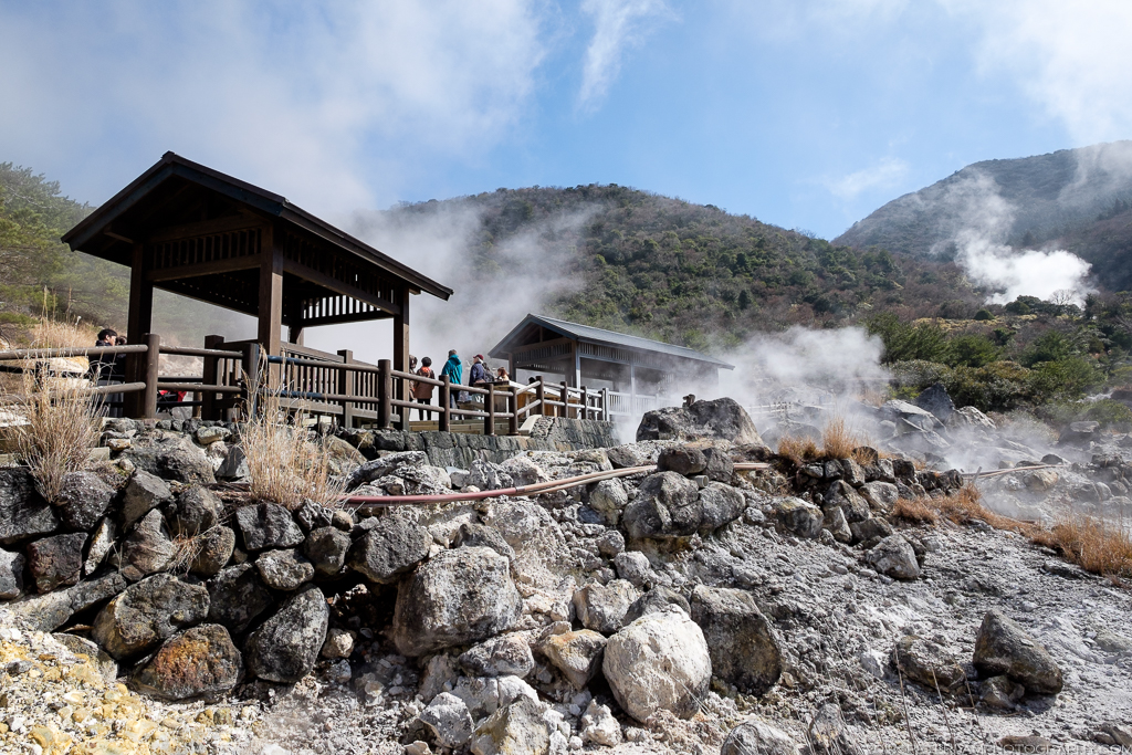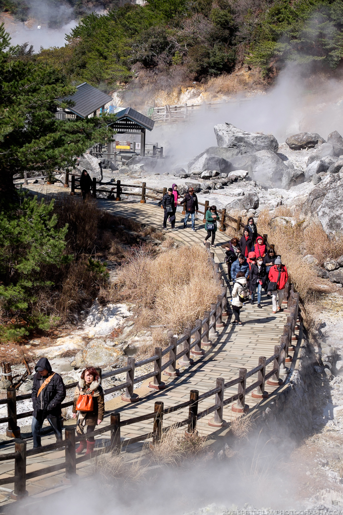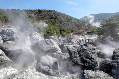 The most popular attraction are the Jigoku (or Hells), an area of volcanic activity where hot water and gases spout from fissures in the ground. Several paths and paved walkways wind through the site, allowing the visitor to experience this Buddhist idea of hell – scalding hot steam billows from below, accompanied by bubbling and hissing, and a strong acidic smell of sulphur.