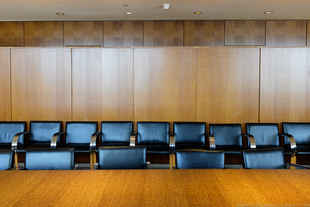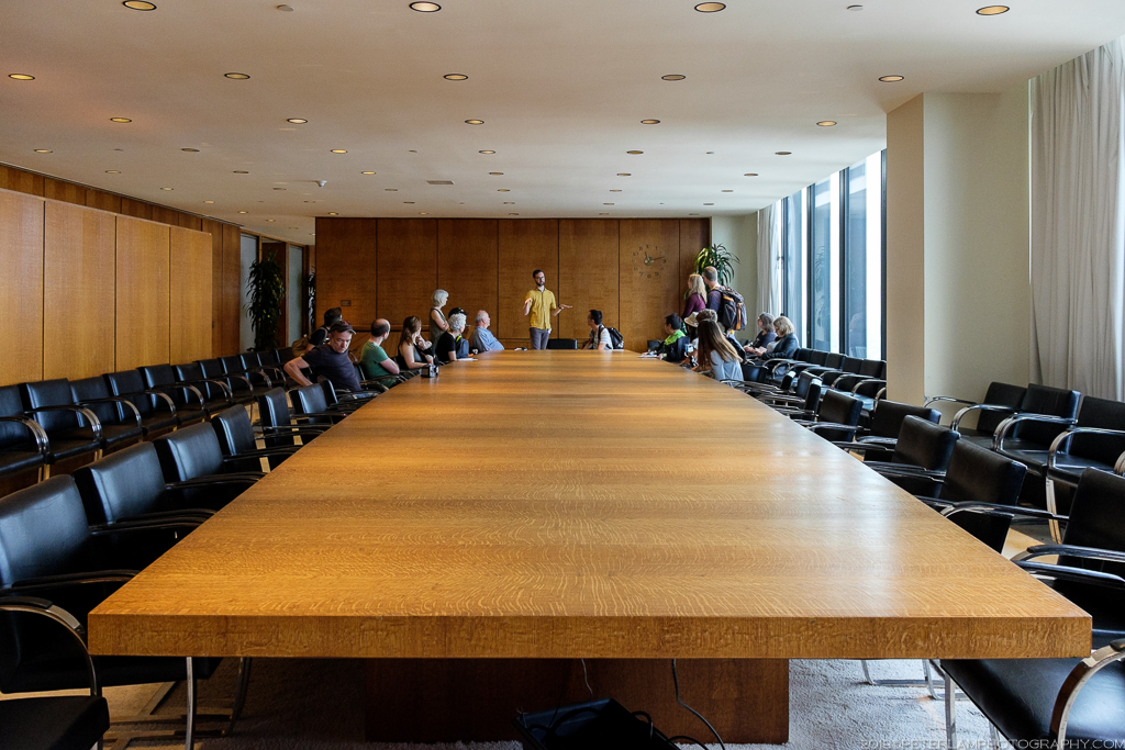 Mies van der Rohe was given complete control of the project, including interior design right down to the furniture. Some of the most valuable and coveted items on the floor are his original Barcelona loungers located in quiet corners and Brno chairs that line the massive boardroom table (which had to be airlifted in during construction). Fans of mid-century modern design will feel right at home.