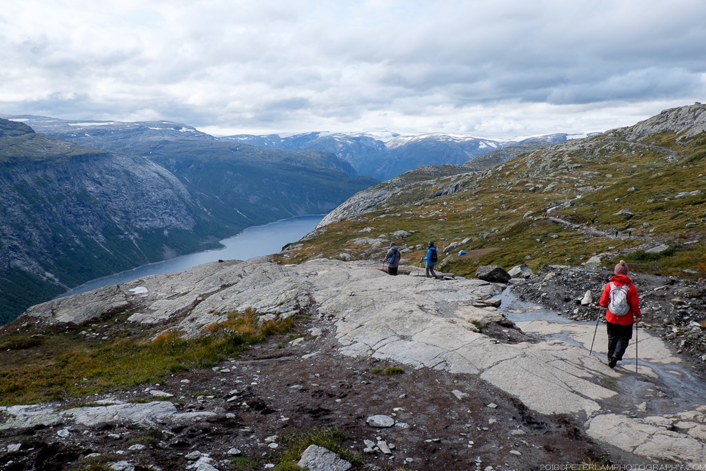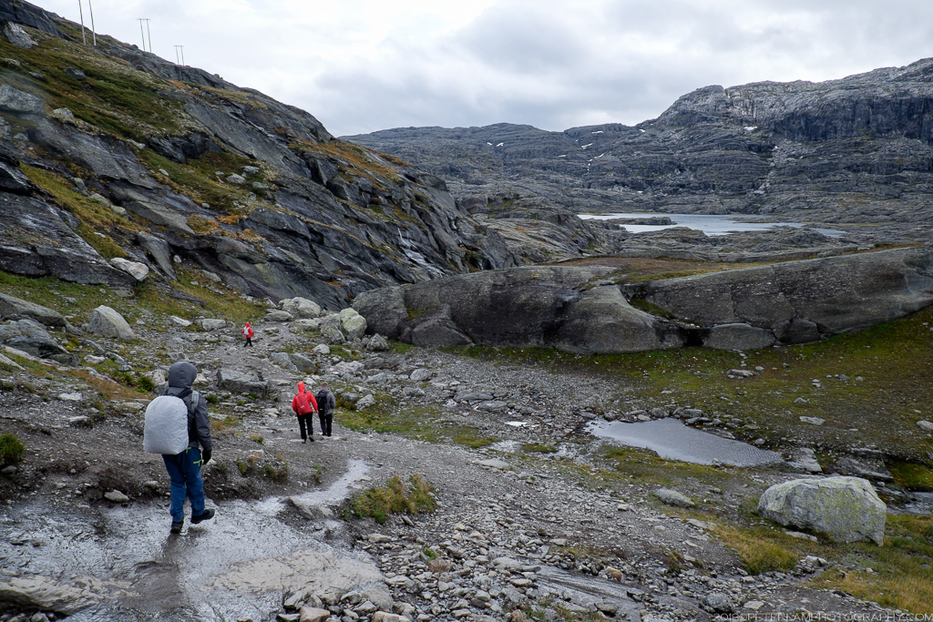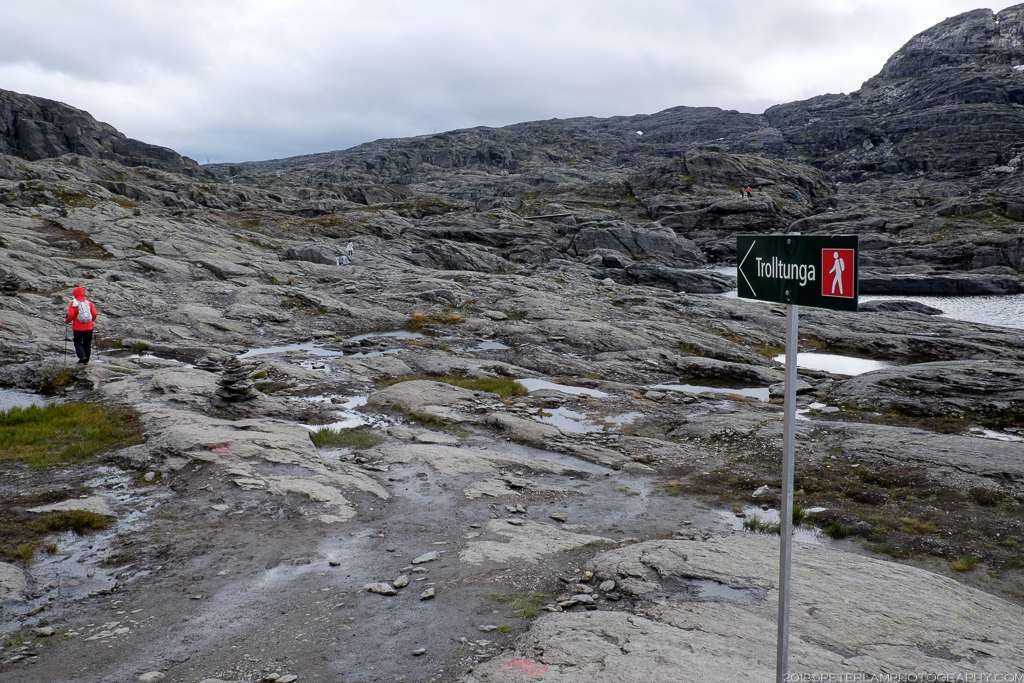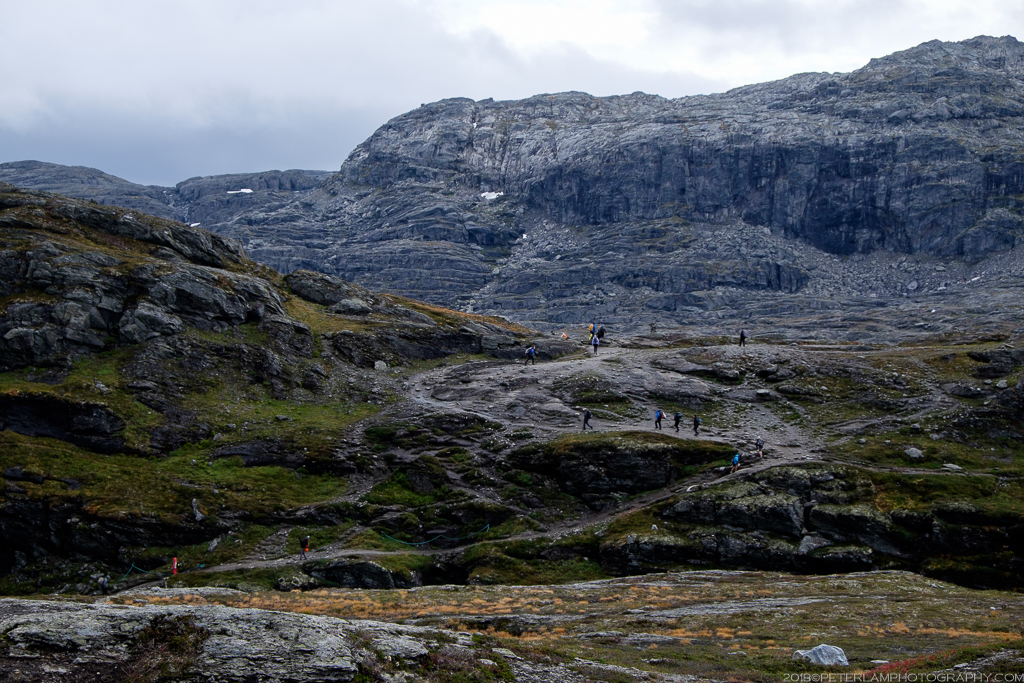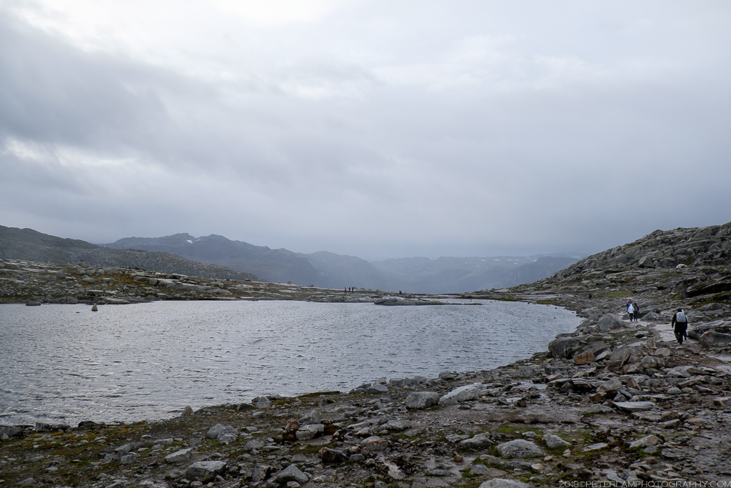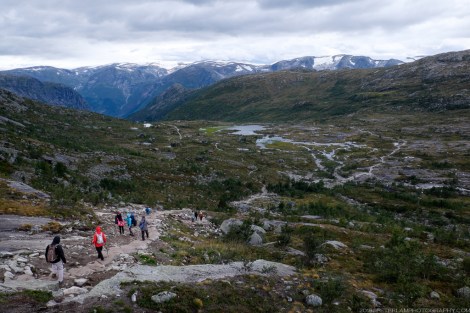 The full hike is a 27-km roundtrip trek from the village of Skjeggedal that generally takes 10 to 12 hours, including time waiting for the photo op at the cliff. Total elevation is gain 1,100 meters, so it is a physically demanding hike. A toll road has recently opened that allows you to alternatively start at the Måglitopp plateau, essentially bypassing the first and steepest part of the trail, and also shortening the total distance to about 20 kilometers. We went for this ‘cheat’ option primarily because 1) we were running on less than 5 hours sleep due to our late arrival to Odda on the previous night, and 2) rain was forecasted all morning.