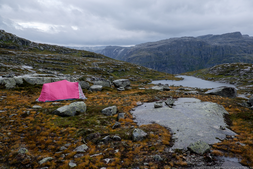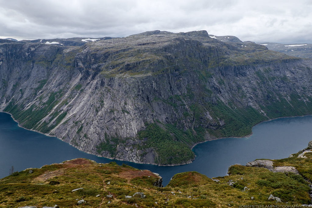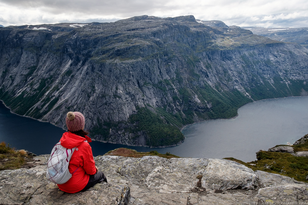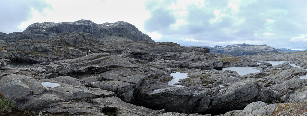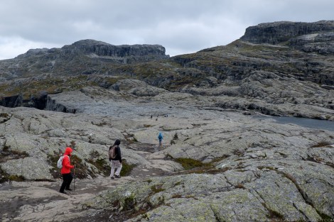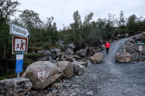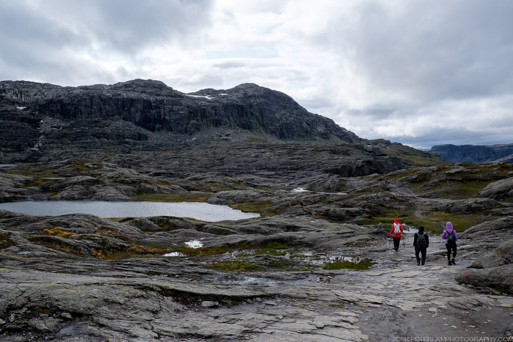 The full hike is a 27-km roundtrip trek from the village of Skjeggedal that generally takes 10 to 12 hours, including time waiting for the photo op at the cliff. Total elevation is gain 1,100 meters, so it is a physically demanding hike. A toll road has recently opened that allows you to alternatively start at the Måglitopp plateau, essentially bypassing the first and steepest part of the trail, and also shortening the total distance to about 20 kilometers. We went for this ‘cheat’ option primarily because 1) we were running on less than 5 hours sleep due to our late arrival to Odda on the previous night, and 2) rain was forecasted all morning.