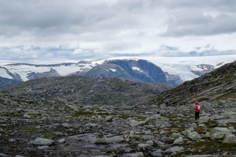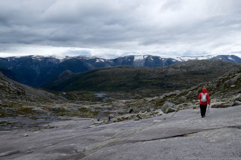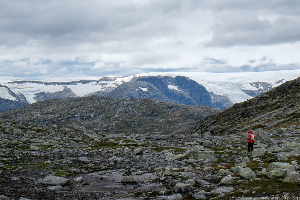 After a well deserved rest and lunch refuel, it was time for the 10-km return hike to the trailhead. With the rain ended and the sun peeking through the clouds, the rugged landscape seemed completely different from just a few hours ago. There were magnificent views of Ringedalsvatnet lake surrounded by steep cliffs, and in the distance, snow capped peaks and glaciers.