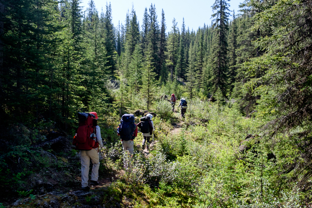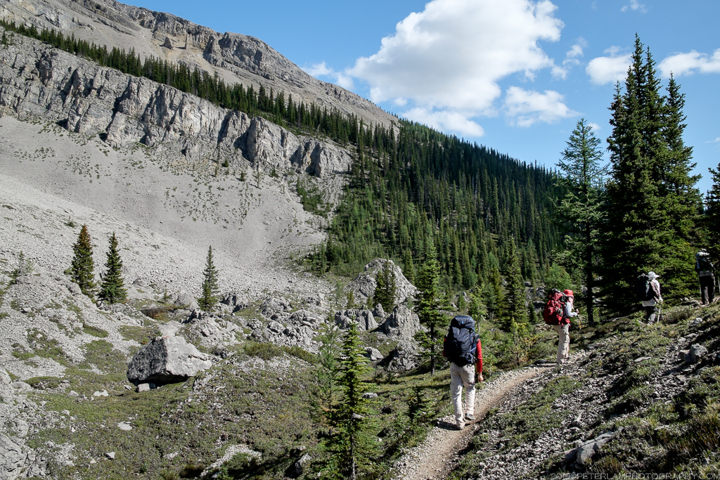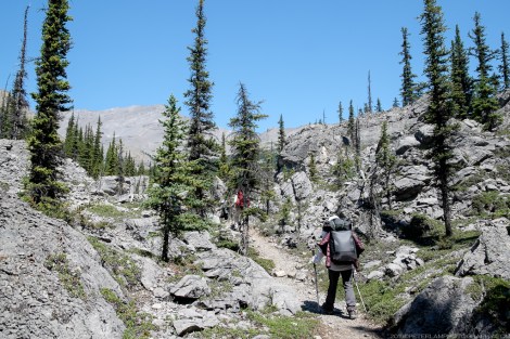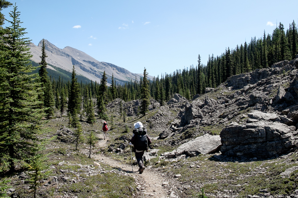 It’s Day 2 of our 6-day trek in Mount Assiniboine Provincial Park and we’re excited to get on the trail again after our first night of camping. The day’s hike is a very manageable 9 kilometers through two craggy valleys with a gradually ascending elevation. From Porcupine camp through Golden Valley and the Valley of the Rocks, this section is some of the most rugged we would cover during the trip.