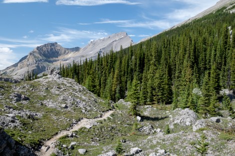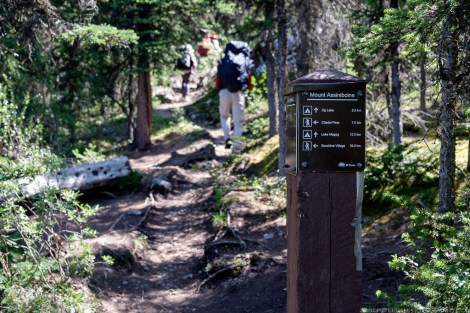 The most popular route to Assiniboine is through Bryant Creek and over Assiniboine Pass. It is a well-marked trail. The helicopter flight path to Assiniboine follows this hiking route and expect to hear helicopter noise on flight days. Most of the hike follows a creek bottom, so the scenery doesn’t start opening up until the Bryant Creek Warden’s Cabin.