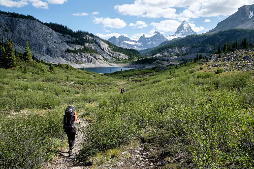 The seemingly endless trail through the Valley of the Rocks finally crests on a hill that reveals an incredible view of another valley, with majestic Mount Assiniboine in the distance. On the valley floor we could clearly see Og Lake, our destination for the day. This was our the first clear view of the peak since we started out from Sunshine two days ago, and it was encouraging to see that we were so much closer.