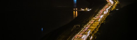 The North Lantau Highway (北大嶼山公路) this evening, with a full red moon on a rare clear night. You can make out the Tsing Ma bridge in the distance.